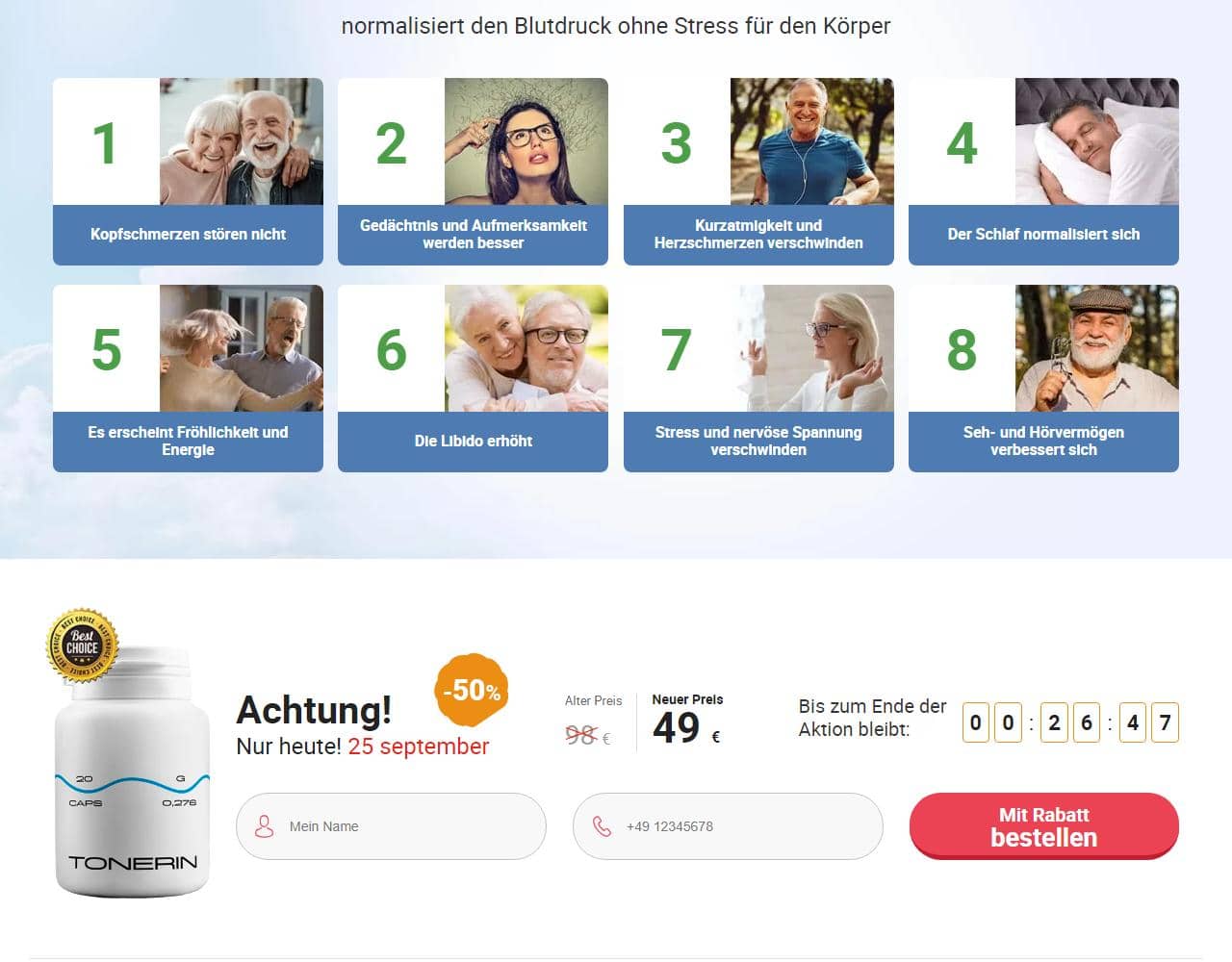 - Variabilität in der Anwendung. Tonerin ist für alle empfehlenswert, die eine hochwirksame Vorbeugung gegen Herz-Kreislauf-Erkrankungen oder die Heilung eines bestehenden Bluthochdrucks anstreben;